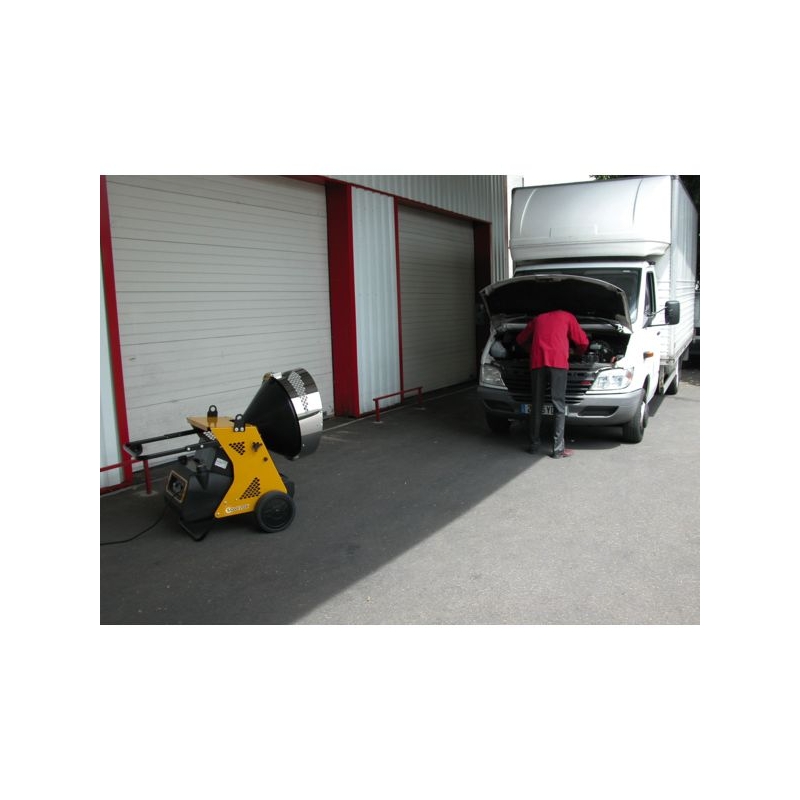 Utilisation intérieure et extérieure. Rayonnement infrarouge cumulé à un ventilateur soufflant. Combustion directe. Brûleur fuel à allumage automatique. Contrôle de flamme et sécurité de surchauffe. Peut-être piloté par un thermostat, une horloge ou une minuterie (en option). Carburant : fuel, gasoil ou GNR Alimentation : 230 V