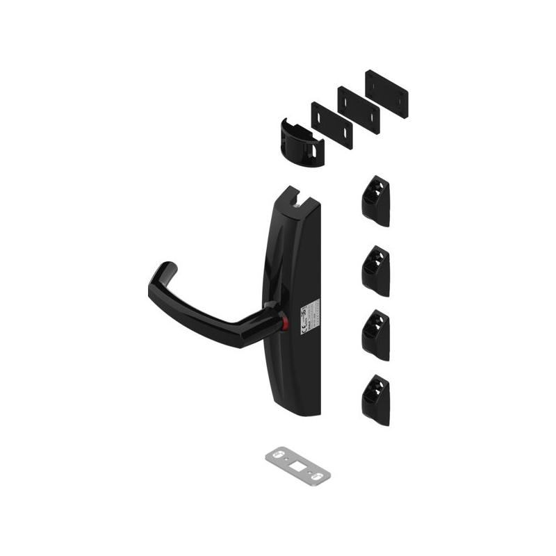 Pour tout type de porte bois, alu, pvc, acier montée sur pivot ou sur paumelles, n'excédant pas 200 kg et de dimensions inférieures ou égales à 2520 mm de haut et 1320 mm de large. Ouverture par rotation ¼ de tour. Visualisation ouvert/fermé par signalétique vert/rouge, manœuvrable de l'extérieur. Fournie à main gauche, inversion rapide du sens de la main lors du montage. Ensemble composé de : - 1 boîtier, - 4 guides de tringle, - 1 gâche basse, - 1 gâche haute avec cales, - cales. Conforme à la norme EN 179. Conditionnement : boite