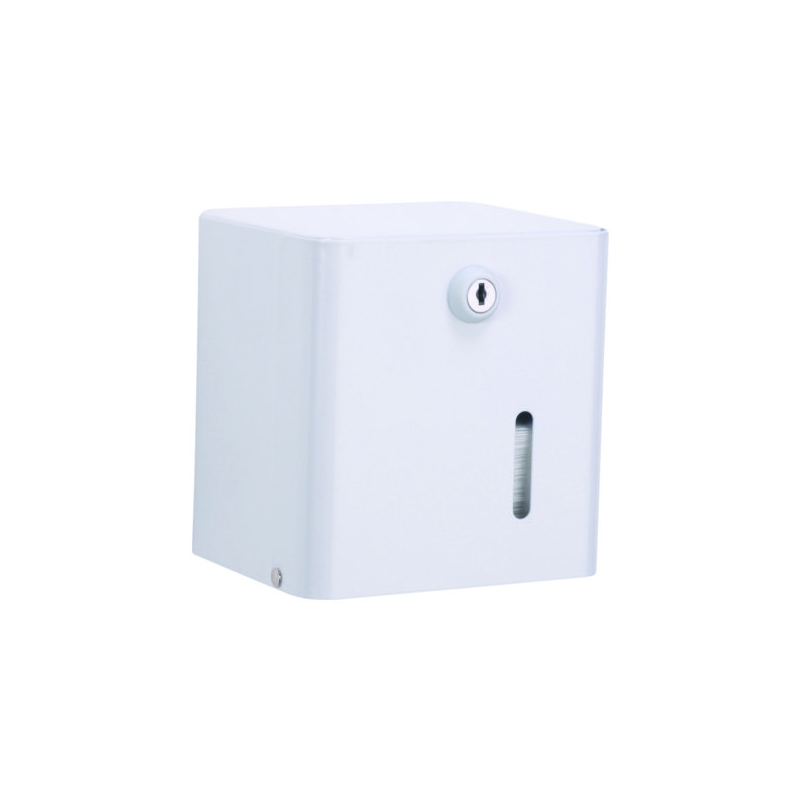 Distributeur de papier hygiénique en paquets (2 paquets enchevêtrés) ou rouleau (1 rouleau). Corps en acier poudré anti-UV blanc avec repère de contrôle du consommable. Fermeture par serrure à clé. L x H x P : 135 x 135 x 115 mm