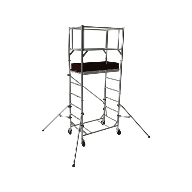 Utilisation sur sol plat, usage ultra intensif. En acier soudé galvanisé. Montants de 45 mm. Base monobloc roulante pouvant servir de chariot de transport. Plancher acier. Garde-corps monobloc. Montage et démontage sans vis ni outils, en sécurité. Roues directionnelles et autobloquantes Ø 160 mm. 4 stabilisateurs pivotants. Passage des portes de 73 cm. Grutable. Dimensions du plancher : 1,10 x 0,60 m Charge maxi. : 200 kg/m² Norme : décret 2004-924