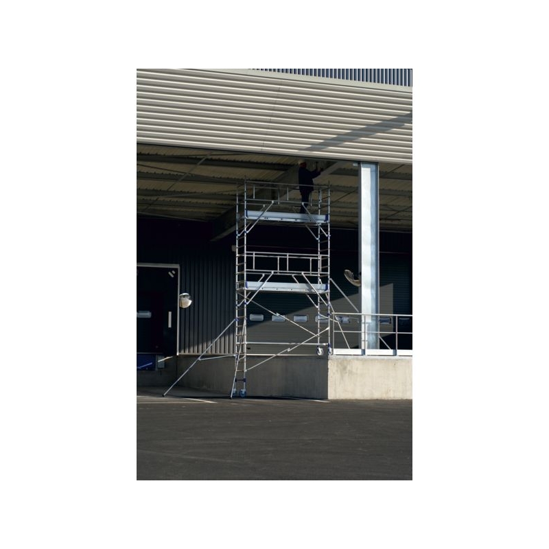 Utilisation sur sol plat ou dénivelé. Usage ultra intensif. En aluminium. Plancher alu/bois avec trappe d'accès et plinthes aluminium amovibles. Garde-corps monobloc. Système de liaison breveté Ergoblock pour un blocage fiable et d'un seul geste des stabilisateurs et des gardes-corps. Montage en sécurité par une seule personne. Roues Ø 200 mm réglables sur 175 mm tous les 12,5 mm. Stabilisateur réglable en longueur. Charge maxi. : 200 kg/m² Norme : NF - EN 1004-1 - Décret 2004-924