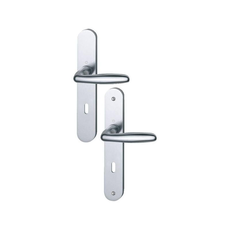 Pour porte intérieure d'épaisseur 38 à 47 mm. Plaque : 234 x 39 mm Entraxe de fixation : 195 mm Entraxe de serrure : 70 mm Longueur béquille : 124 mm Saillie de la béquille : 55 mm Fouillot carré : 7 mm Finition : aluminium aspect argent Conditionnement : boîte