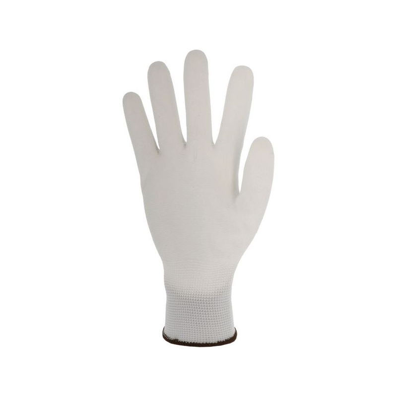 Enduction polyuréthane sur paume et bouts de doigts. Support tricoté en polyamide, sans couture, jauge 13. Dos aéré, poignet élastique. Manipulation légère / Milieu sec Applications métiers : mécanique de précision, manipulation fine en milieu sec, assemblage de petites pièces, industrie électronique Coloris : blanc Taille : 7 à 11 Norme : CE Cat II - EN 388 (3121X)