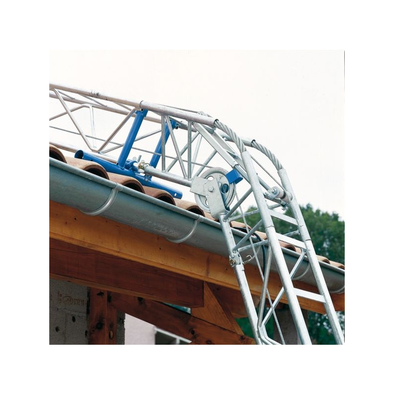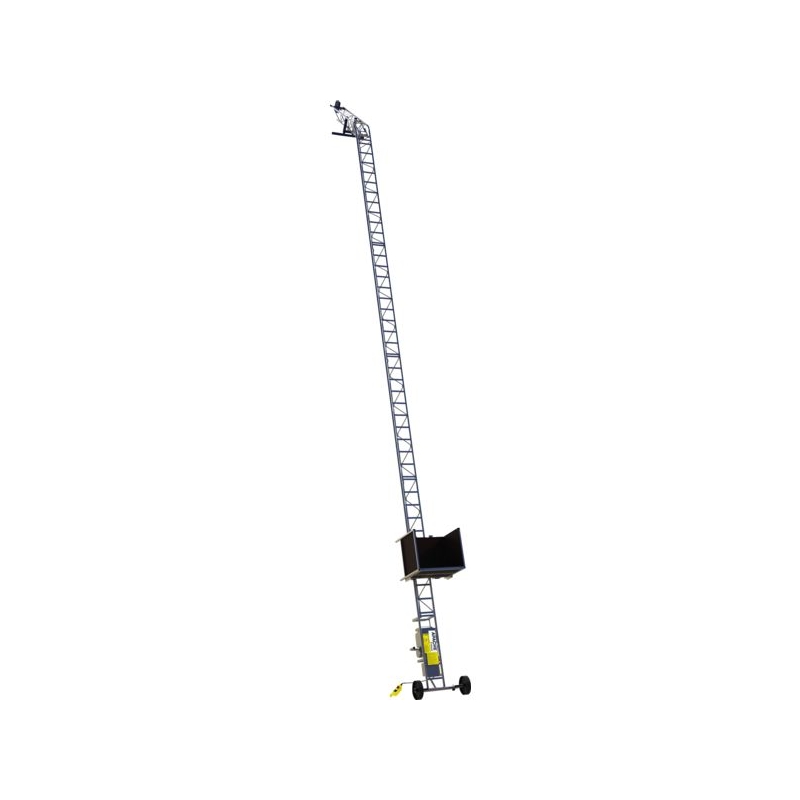 Pour les travaux de maçonnerie ou de couverture. Structure tubulaire acier galvanisé formant une poutre triangulaire. Installation simple et rapide avec dispositif d’auto-relevage. Treuil électrique 230 V mono, prise 2 P+T 16 A. Genouillère réglable de 0 à 65°. Télécommande longueur 3 m IP 65. Équipé d'une caisse matériaux dont les 2 côtés sont amovibles. Hauteur maxi. : 20 m (avec éléments de structure à commander séparément) Charge utile : 150 kg/m² Vitesse d'élévation : 18 m/mn Poids : 121 kg Norme : NF - EN 12158-2 - directive 2006-42-CE