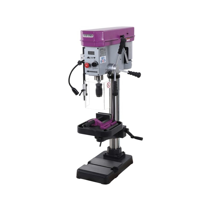Adapté aux métalliers et serruriers. Bâti, tête et socle en fonte aciérée. Transmission par courroies Poly V avec réglage de la tension. Broche montée sur roulements à billes. Variateur de vitesse électronique. Affichage digital de la vitesse de broche. Table inclinable jusqu'à 45 °. Ecran de protection de mandrin amovible asservi. Éclairage à LED. Arrêt coup de poing à accrochage. Alimentation : 230 V monophasée Puissance : 1,2 kW Capacité de perçage : 20 mm Vitesse de broche maxi : 5000 tr/min Cône morse : CM2 Ø colonne : 72 mm Course de broche : 80 mm Dimension de table : 280 x 280mm Livrée avec mandrin auto-serrant 16 mm, queue de mandrin, chasse cône, étau à vis et jeu de brides.