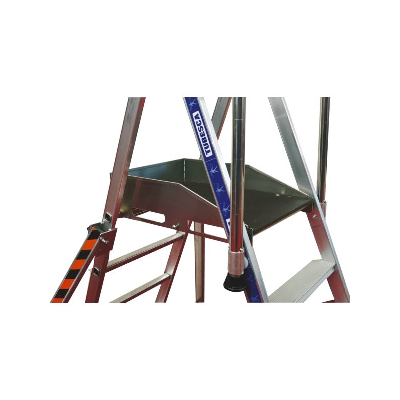 Utilisation sur sol plat. Usage ultra-intensif. En aluminium. Garde-corps 360° avec portillon semi-automatique rigide. Montants de 70 mm renforcés. Plate-forme anti-dérapante 600 x 420 mm avec plinthes intégrées. Marches striées antidérapantes de 80 mm. Tablette porte-outils intégrée. 2 roulettes Ø 160 mm pour les déplacements. Sabots antidérapants haute sécurité. Stabilisateurs à mise en place automatiques. Anneaux de grutage. Charge maxi. : 150 kg 3 à 6 marches : norme PIRL NFP 93353 - EN 131-7 - Décret 2004.924 7 à 8 marches : norme PIRL NFP 93352 - EN 131-7 - Décret 2004.924