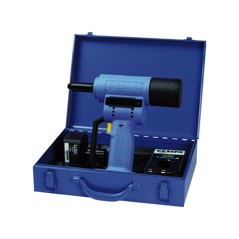 Pour pose de rivets aveugles jusqu'au Ø 5 mm. Batterie grande autonomie. Utilisation en intérieur et extérieur. Équipée de : - embouchures 17/24 (montée), 17/27, 17/29, 17/32, - 1 clé de montage SW12, - 2 batteries Li-Ion 14,4 V 1,3 Ah, - chargeur. Poids : 2 kg Livrée en coffret métal.