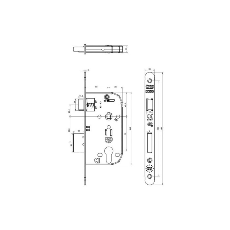 Réversible sans démontage et sans outil. Pêne ½ tour en laiton. Pêne dormant rectangulaire bi-matière acier/zamak. Gâche garantie 2 ans et à commander séparément. Coffre en acier galvanisé : 148x78x14 mm Têtière en acier à bouts ronds : 230x20x3 mm Axe : 50 mm Entraxe : 70 mm Fouillot carré : 7 mm Finition : époxy noir Conditionnement : boite